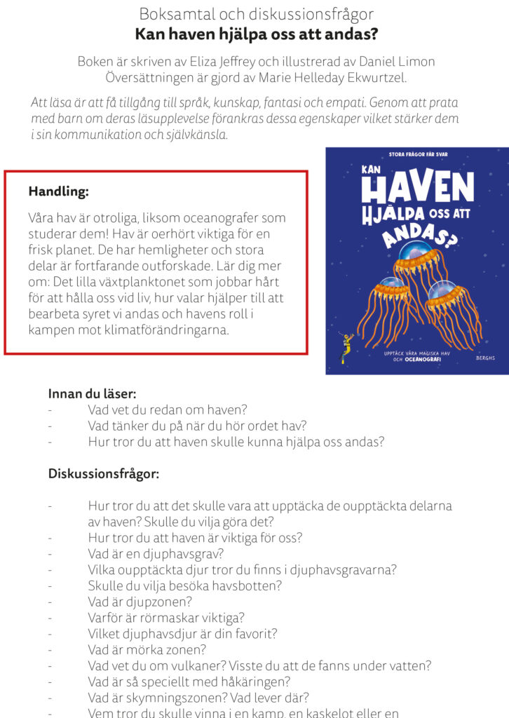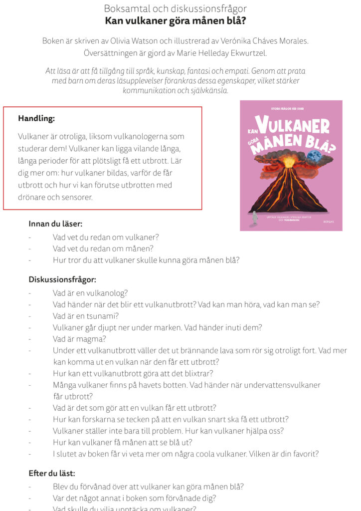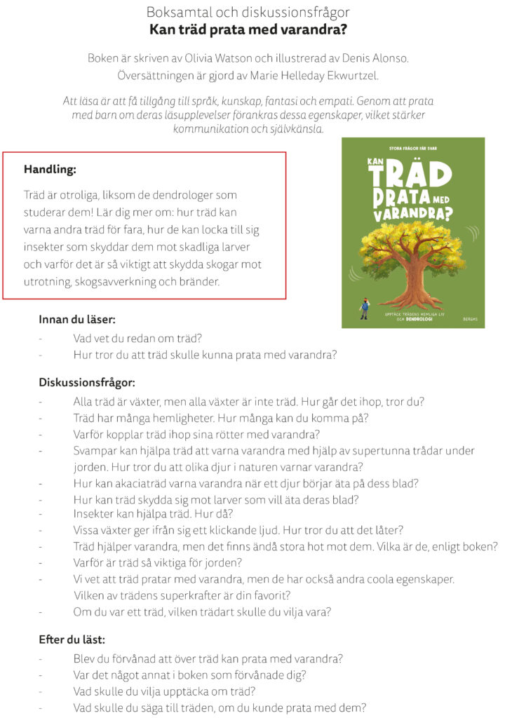 Till flertalet av våra böcker har vi lärarhandledningar, boksnack-frågor eller annat roligt material. För mer information kontakta info@berghsforlag.se