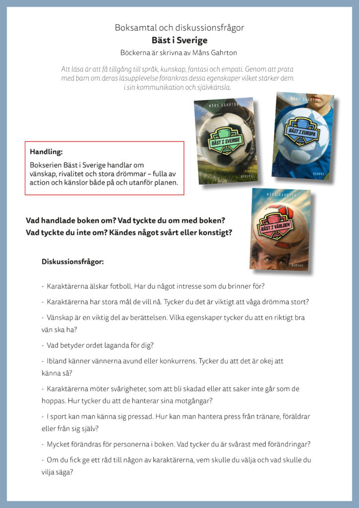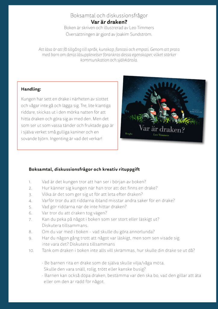 Till flertalet av våra böcker har vi lärarhandledningar, boksnack-frågor eller annat roligt material. För mer information kontakta info@berghsforlag.se